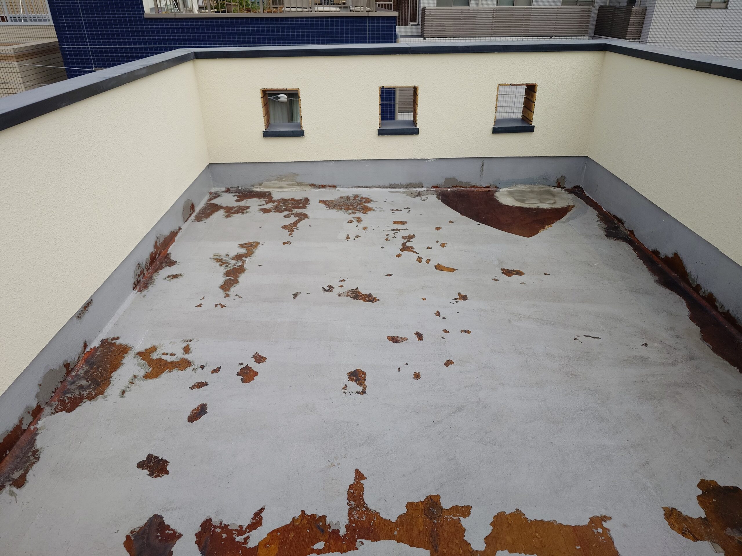 今回は特に木造4階建てという事もあり、おそらく地震の時はかなり揺れるかと思います。劣化状況が普通に防水材が劣化していく状況とは違ったので恐らくそう思います。