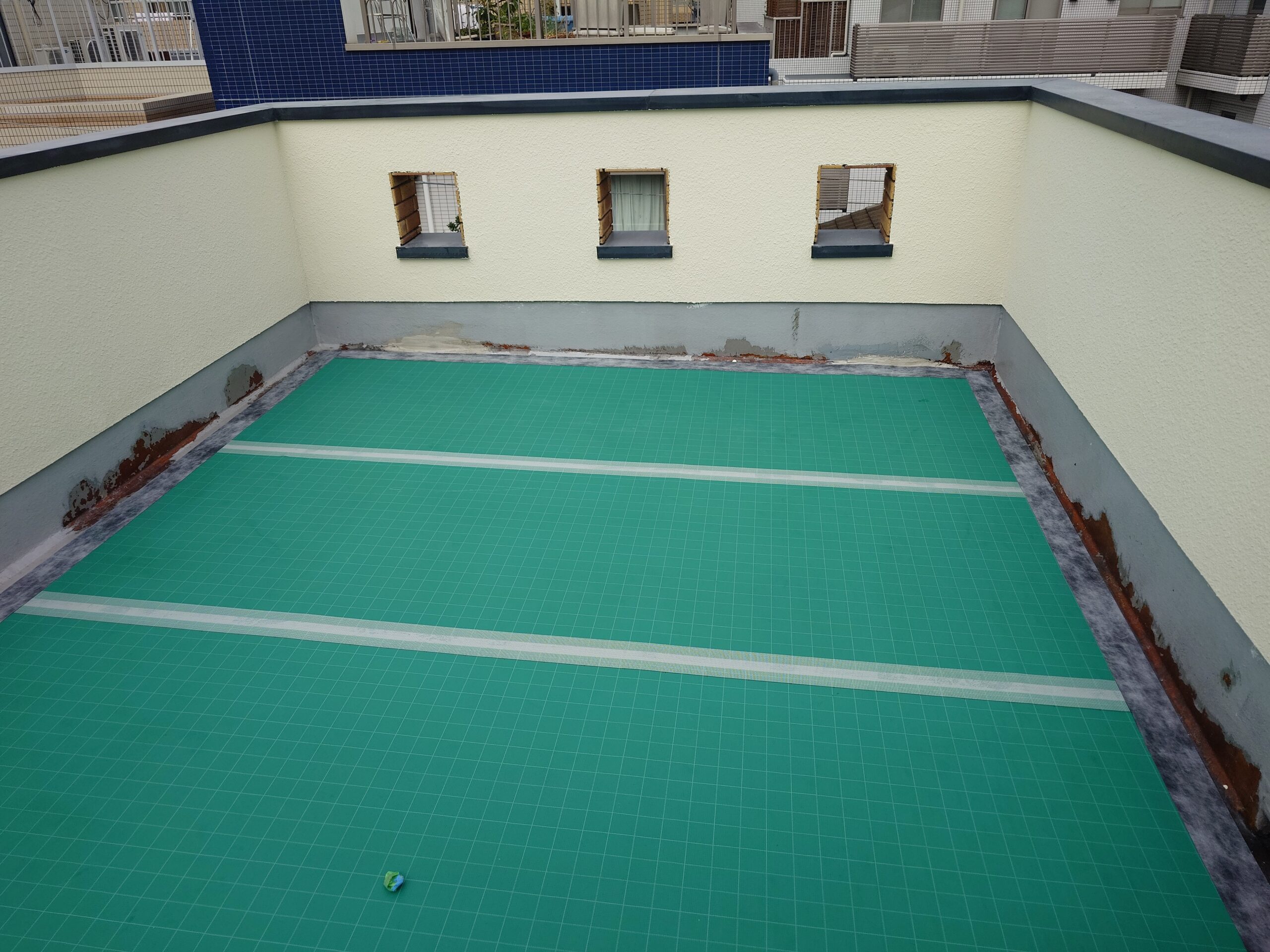 ケレンのままでは降雨で雨漏り事故が発生してしまうので、雨が降っても漏らないところまで進めておくのが屋上防水工事の難しい所です。今回は通気緩衝マットを張り終えるまでが今日の目標です。