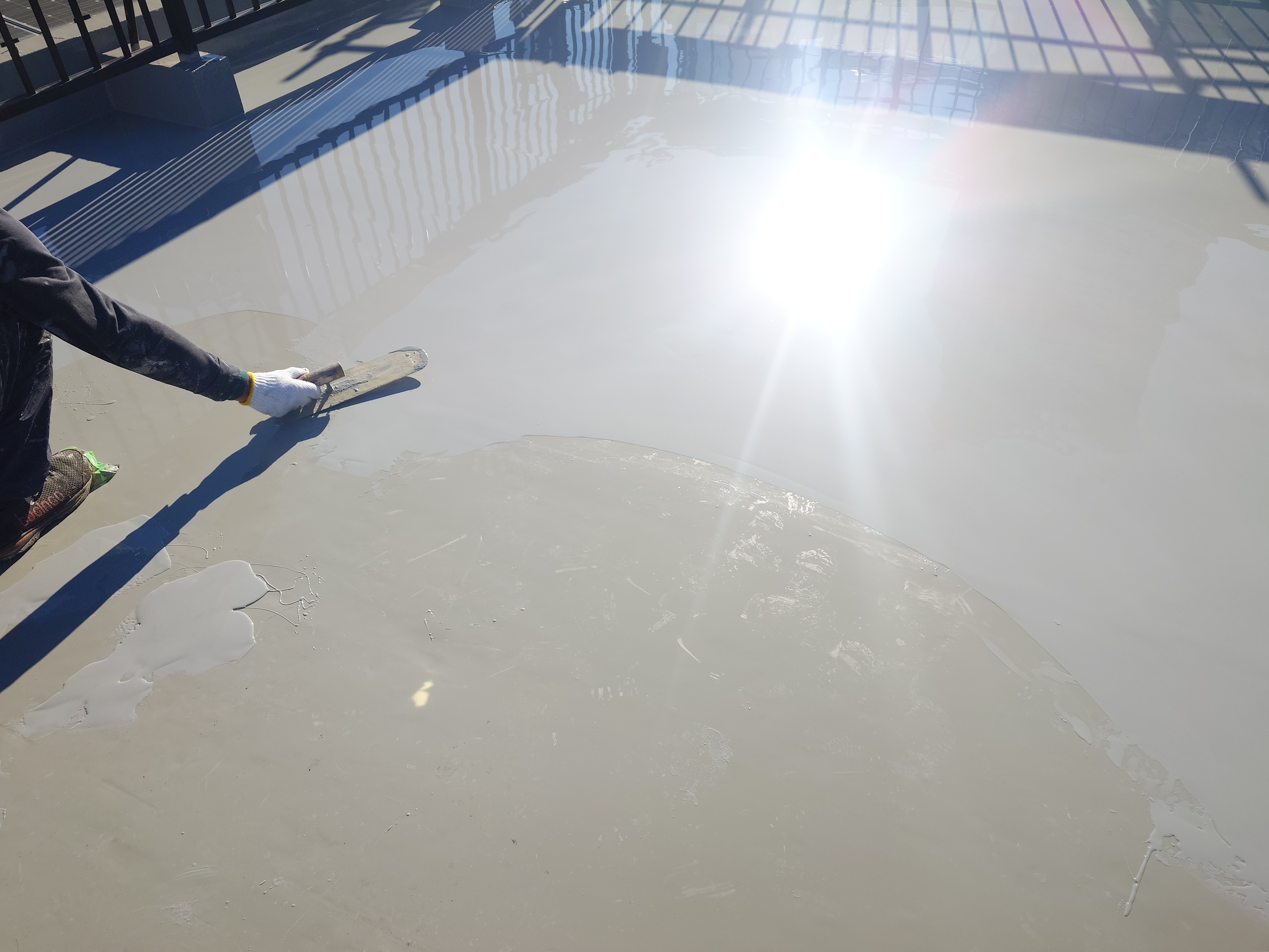 屋上の状況、環境、排水溝の大きさ、今塗布している場所、天候、気温などいろんなことを考慮して作業しています。
