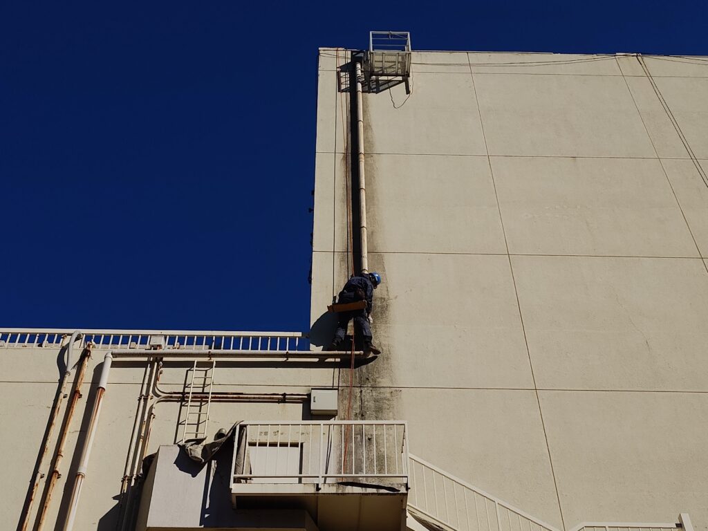 まずは仮設から弊社は外壁にぶら下がりの作業は得意とするところですが、ゴンドラ作業以外のブランコやチェアーゴンドラでは力が入りずらいので力作業が難しいです。