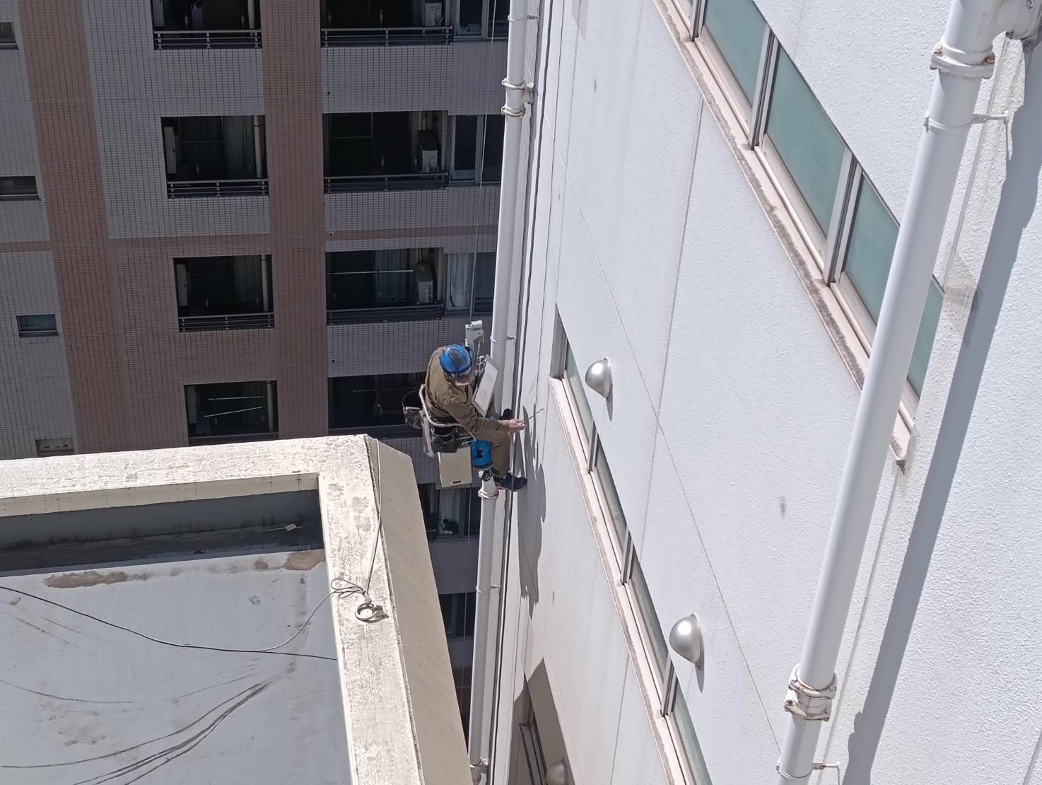 今日は外壁調査をしていました。築年数は20年くらいです。9階建てのオフィスビルで外壁はタイル部分と塗装部分があります。
