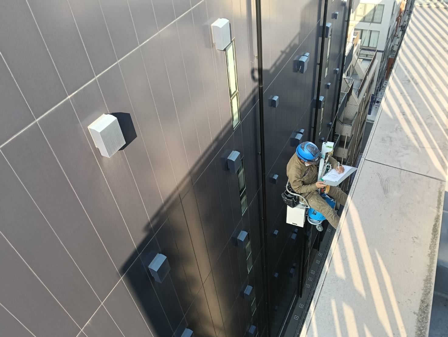 今回は一人乗りの椅子型ゴンドラ(チェアーゴンドラ)を使用して作業してます。